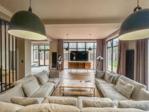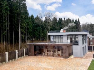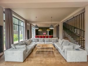На первом уровне большая гостиная с обеденной зоной, кухня,большая гардеробная, гостевой с/у, прачечная комната оборудована всей необходимой техникой, 3 спальни со своими с/у и гардеробными.