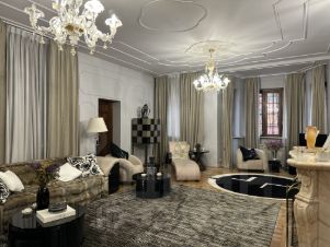 гараж на 2 мм, блок для персонала с отдельным входом. В интерьере использованы скульптуры Daum, работы Энди Уорхола, изделия Фаберже и др.