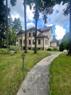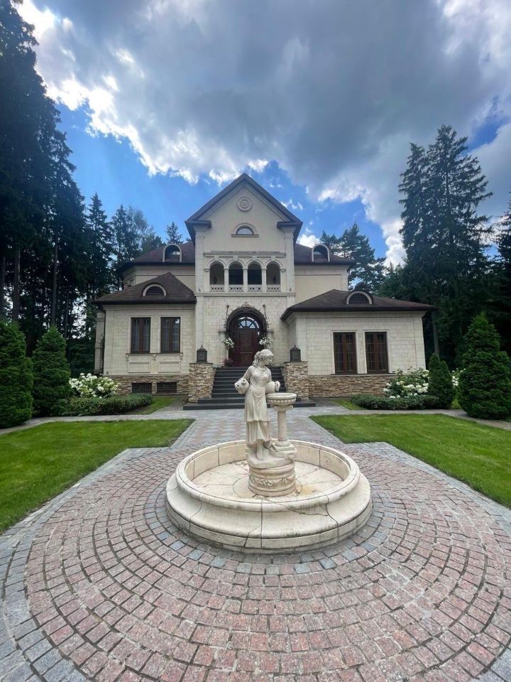 домовладение площадью 650 м . Фасад отделан натуральным облицовочным камнем и коваными элементами. Во внутренней отделке преобладают светлые тона, использованы натуральные отделочные материалы(мрамор,паркет). Дом полностью меблирован, итальянские гарнитуры на заказ. Есть гараж на 2машины, отдельно стоящая русская баня.На лесном участке полностью выполнены ландшафтные работы: проложены дорожки и проведено освещение. Цоколь: зона СПА, сауна, душевая, хамам,винный погреб.Первый уровень: гардеробная, гостевой сан узел,домашний кинотеатр, каминный зал,кухня-столовая с выходом на террасу,гостевая спальня,ванная комната.Второй уровень: хозяйская спальня,с гардеробной и сан узлом, 2спальни с сан узлом. Имеется квартира для персонала над гаражом.