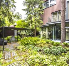 Участок ровный, правильной формы, с ландшафтными работами: газон, дорожки, освещение, декоративные насаждения.
