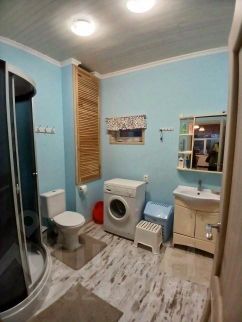 На первом этаже: веранда, прихожая, большая кухня, гостиная, санузел с душевой кабиной. Мебель и необходимая бытовая техника имеется. На втором этаже: четыре спальни - детская, спальня с санузлом и ванной, спальня с санузлом, спальня. Вся обстановка, как на фото.