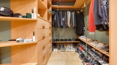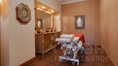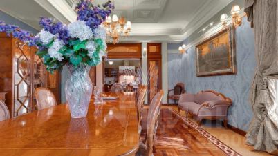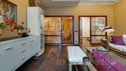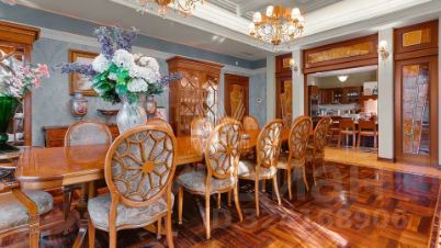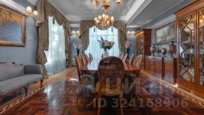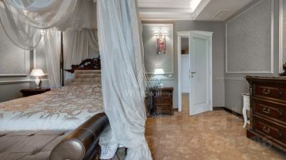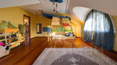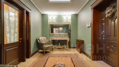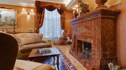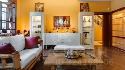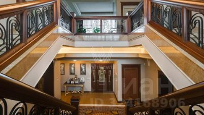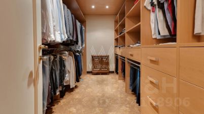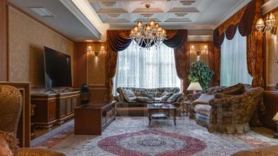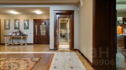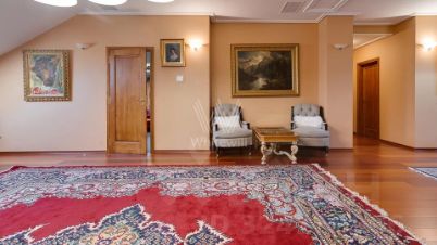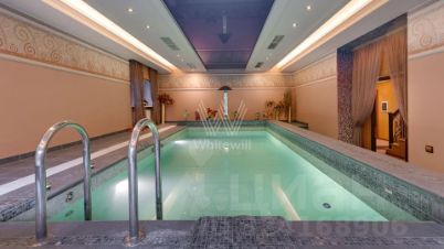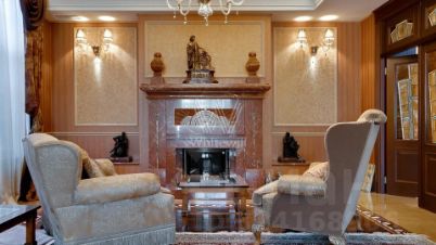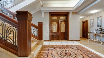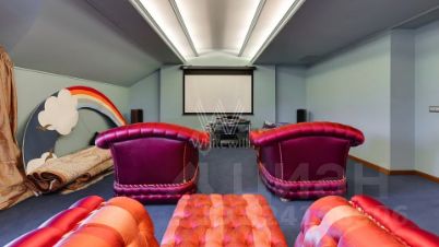 Внутренние пространства оформлены в спокойной палитре: в отделке использованы натуральный камень, ценные породы дерева, фактурные ткани и коллекционная мебель. В гостиной установлен камин из природного камня, создающий выразительный акцент в общем ансамбле. Планировка включает четыре спальни с собственными санузлами и гардеробными, кинозал и бассейн.