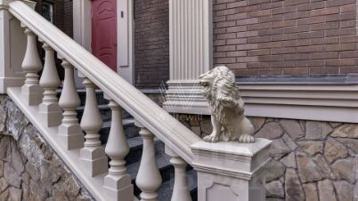 Шульгино. Загородная резиденция площадью 1 200 м² расположена на участке 23 сотки в центральной части посёлка. Фасад, облицованный тёмным клинкером, подчеркнут белыми карнизами и элегантной балюстрадой. Окна с тонкой расстекловкой и светлыми рамами придают дому характер классического английского поместья.