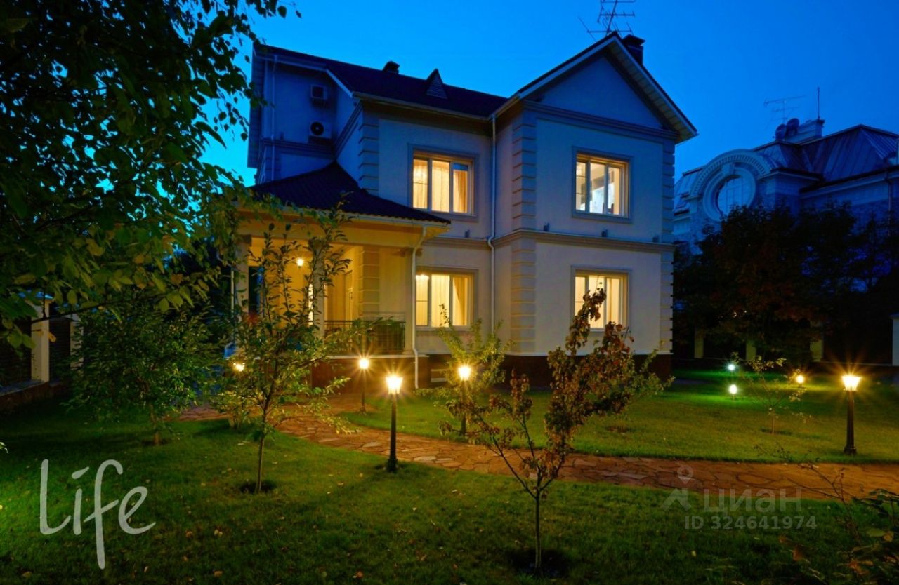 Участок правильной прямоугольной формы, выполнен ландшафтный дизайн. Газон, декоративные деревья и кустарники, ночное освещение.