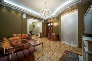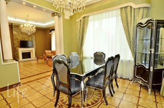 Интерьер выполнен в классическом стиле, со вкусом подобрана мебель и аксессуары. Гостиную украшает дровяной камин.