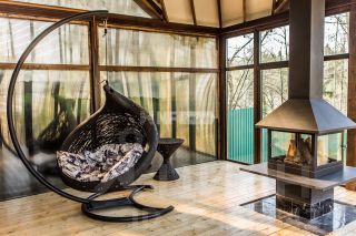 Дом расположен на рельефном участке, с вековыми соснами, прудом и речкой внизу.