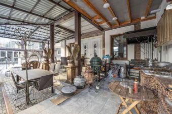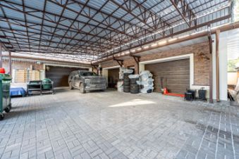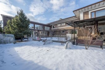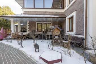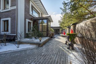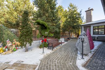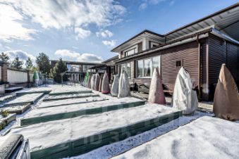 На участке выполнен ландшафтный дизайн с зонированием: зеленые лужайки, открытая веранда с барбекю, фруктовый сад, аккуратный огородик, теплица, погреб, домик персонала, парковка на 4-6 автомобилей. Зеленая изгородь из хвойных деревьев укрывает усадьбу от посторонних глаз.
