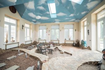 1 этаж: холл-гостиная с камином, кабинет, кухня с окном на бассейн, гостевая спальная с гардеробной, столовая, бассейн с противотоком, помещение под зимний сад, гараж на две машины;