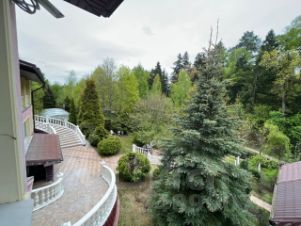Входная группа включает в себя две сводчатые мраморные лестницы. Светлый трехуровневый дом оформлен в изысканном классическом стиле, оборудован эксклюзивной антикварной мебелью и современной бытовой техникой от ведущих мировых брендов. Оснащен системой видеонаблюдения, автоматического открытия ворот.