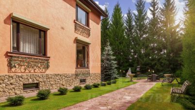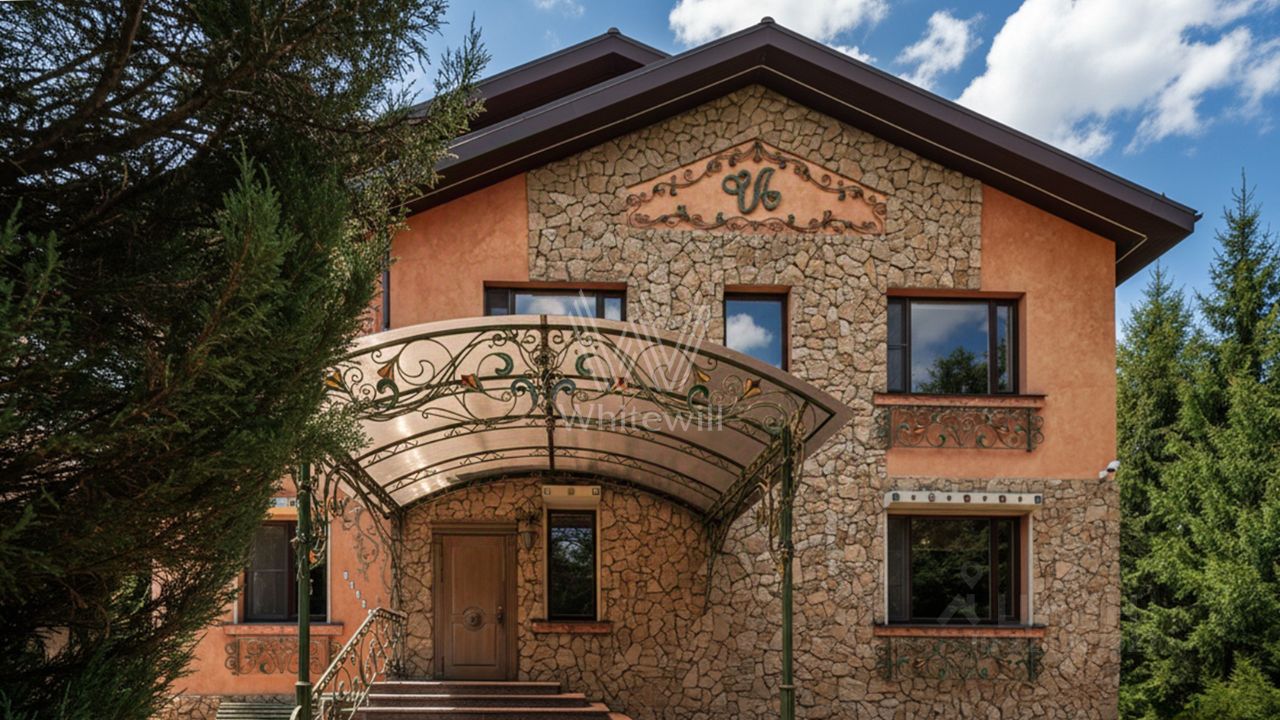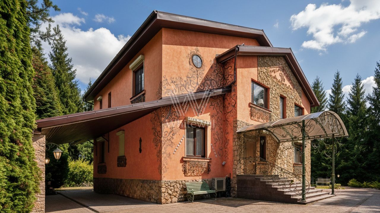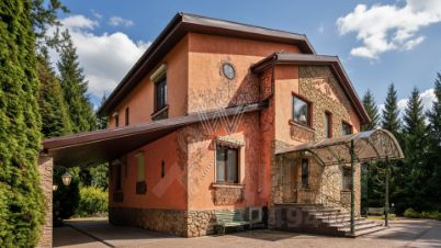 Усово-Плюс. Загородный коттедж площадью 600 м² расположен на полевом участке 14 соток. Фасад, выполненный в европейском стиле, облицован коралловой штукатуркой и плиткой с фактурой камня, а также украшен рисунками с цветочными мотивами.