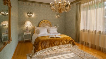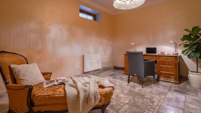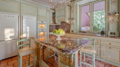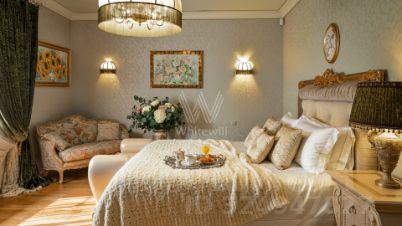 Интерьеры, гармонично сочетающиеся с внешним обликом здания, щедро украшены художественной росписью, лепниной, молдингами, изящными люстрами, антикварными акцентами и предметами ручной работы. Дом укомплектован бархатной мебелью Provasi, роскошным текстилем и бытовой техникой ведущих брендов — Smeg, Miele и Bosch. Система кондиционирования обеспечивает комфортный микроклимат в течение всего года.