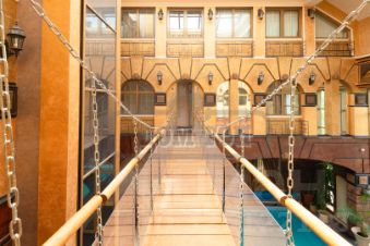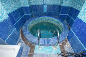 - бассейн площадью 50 кв.м. с оформлением в стиле тропики с подвесным мостиком на уровне второго этажа и перекидным мостиком через водное зеркало,