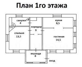 Высокий первый этаж: веранда 8 кв.м. (стол, стулья, скамейка, небольшой шкафчик, электроплита, мини-холодильник), коридор 9 кв.м. (вешалка и тумба), гостиная 14,5 кв.м. (диван, стол, стулья, полки, тумба и телевизор) с проходом на кухню 8,5 кв.м. (кухонный гарнитур, стиральная машинка), спальня 13,5 кв.м. (кровать, тумбочка, зеркало, камин), санузел 4 кв.м. (унитаз, раковина, душевая кабинка, шкафчик).