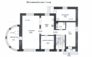 Планировка 1-го этажа: зимний сад, кухня, просторная гостиная, спальня, котельная, сан.узел; 2-го этажа: зимний сад, 4 спальни, гардеробная комната, балкон, 2 сан.узла. Подвал используется, как техническая зона и подсобные помещения.