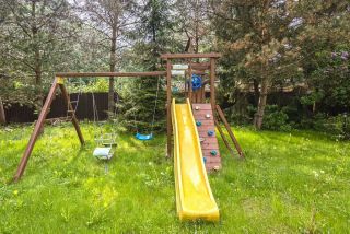 Ухоженная территория участка с беседкой и зоной барбекю, детская площадка, плодовые деревья, хвойники.