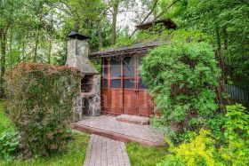 На участке 12 соток расположены основной дом, закрытая беседка с барбекю, гараж на 2 м/м и навес на 2 м/м.