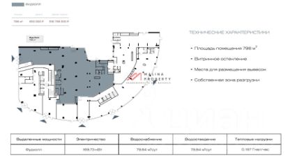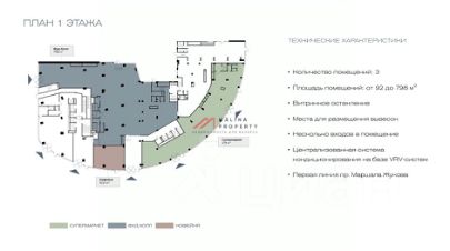 1-й этаж БЦ. Общая площадь 798 м². 1-я линия пр. Маршала Жукова. 3 отдельных входа с улицы. Витринное остекление. Места для размещения вывесок. Собственная зона разгрузки. Эл. мощность 170 кВт. Централизованная система кондиционирования на базе VRV-систем. Тепловые нагрузки 0,129 Гкал/час.
