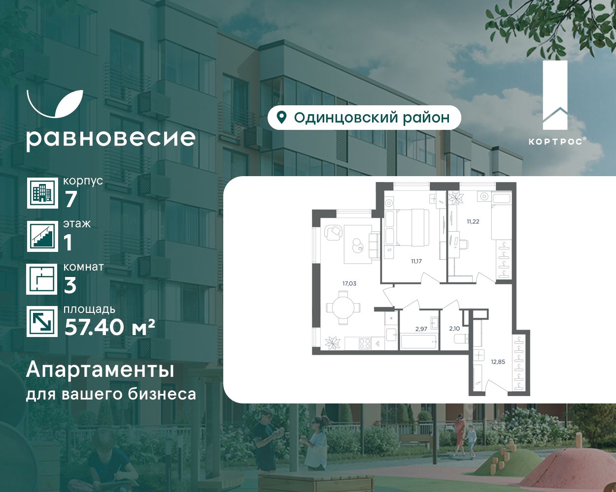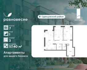 Продаётся апартамент с 3 комнатами общей площадью 57.40 кв. метров на 1 этаже жилого квартала комфорт-класса "Равновесие".
