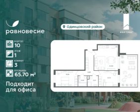 Продаётся апартамент с 3 комнатами общей площадью 65.70 кв. метров на 1 этаже жилого квартала комфорт-класса "Равновесие".