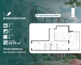 Продаётся апартамент с 3 комнатами общей площадью 65.70 кв. метров на 1 этаже жилого квартала комфорт-класса "Равновесие".