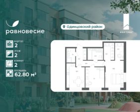 Продаётся квартира с 2 комнатами общей площадью 62.80 кв. метров на 2 этаже жилого квартала комфорт-класса "Равновесие".