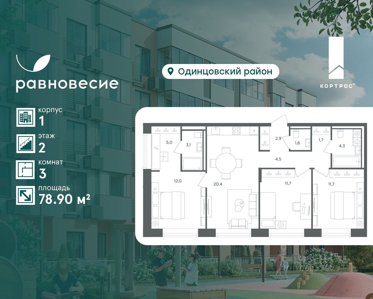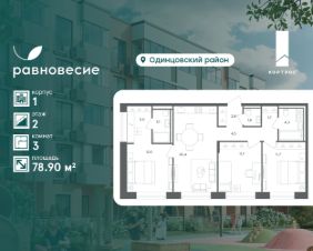 Продаётся квартира с 3 комнатами общей площадью 78.90 кв. метров на 2 этаже жилого квартала комфорт-класса "Равновесие".