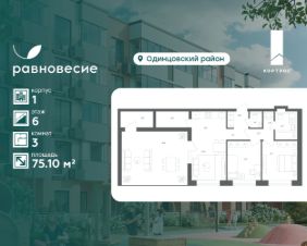 Продаётся квартира с 3 комнатами общей площадью 75.10 кв. метров на 6 этаже жилого квартала комфорт-класса "Равновесие".