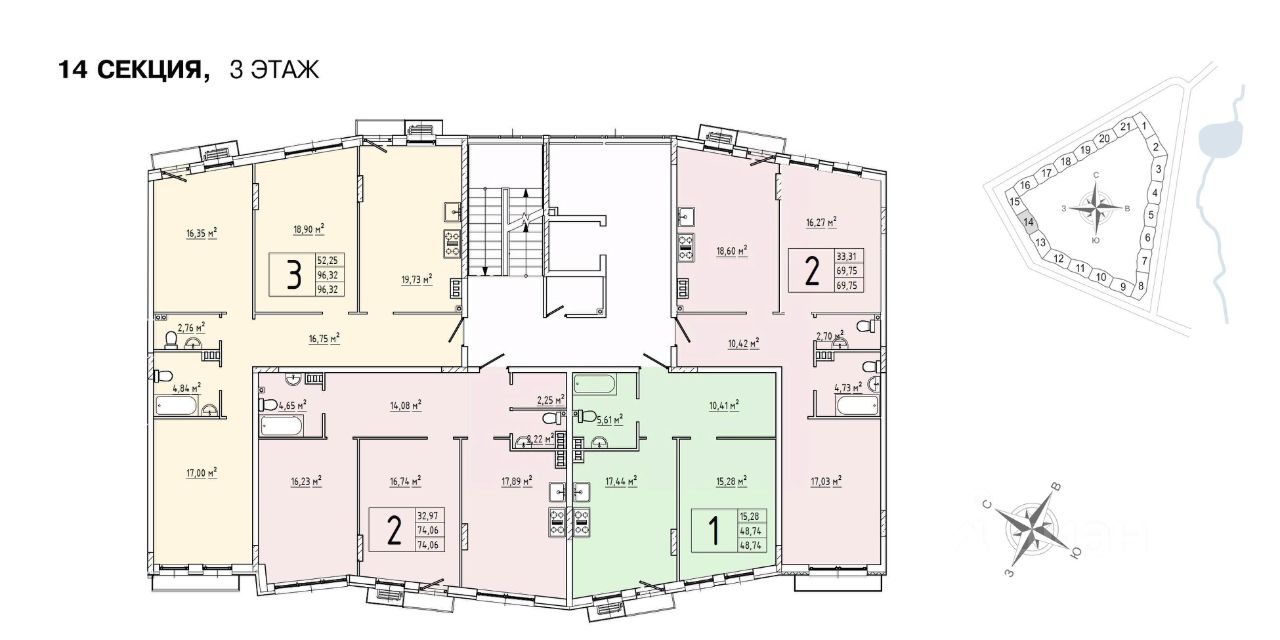 Прямая продажа от застройщика! Продаётся 2-комнатная квартира общей площадью 74,1 кв.м на 3-м этаже 4 этажного дома. Дом сдан.