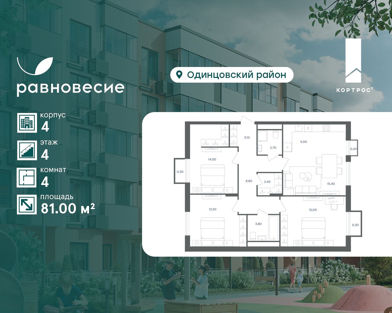 Продаётся квартира с 4 комнатами общей площадью 81.00 кв. метров на 4 этаже жилого квартала комфорт-класса "Равновесие".