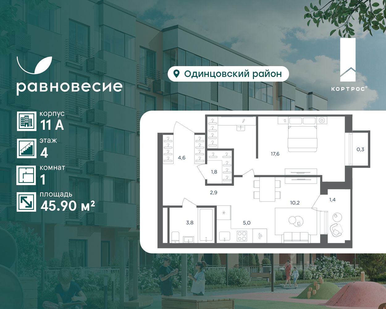 Продаётся квартира с 1 комнатой общей площадью 45.90 кв. метров на 4 этаже жилого квартала комфорт-класса "Равновесие".