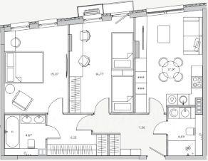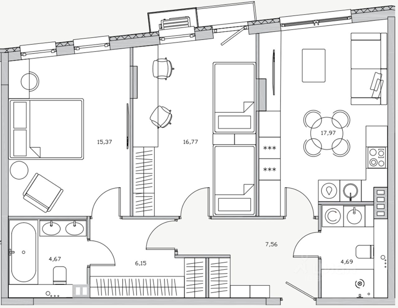 Квартира без отделки в сданном клубном доме "Эльйон" в Одинцовском районе. Свободная планировка. Просторная площадь квартиры с большими окнами и высотой потолка 3,1 м.