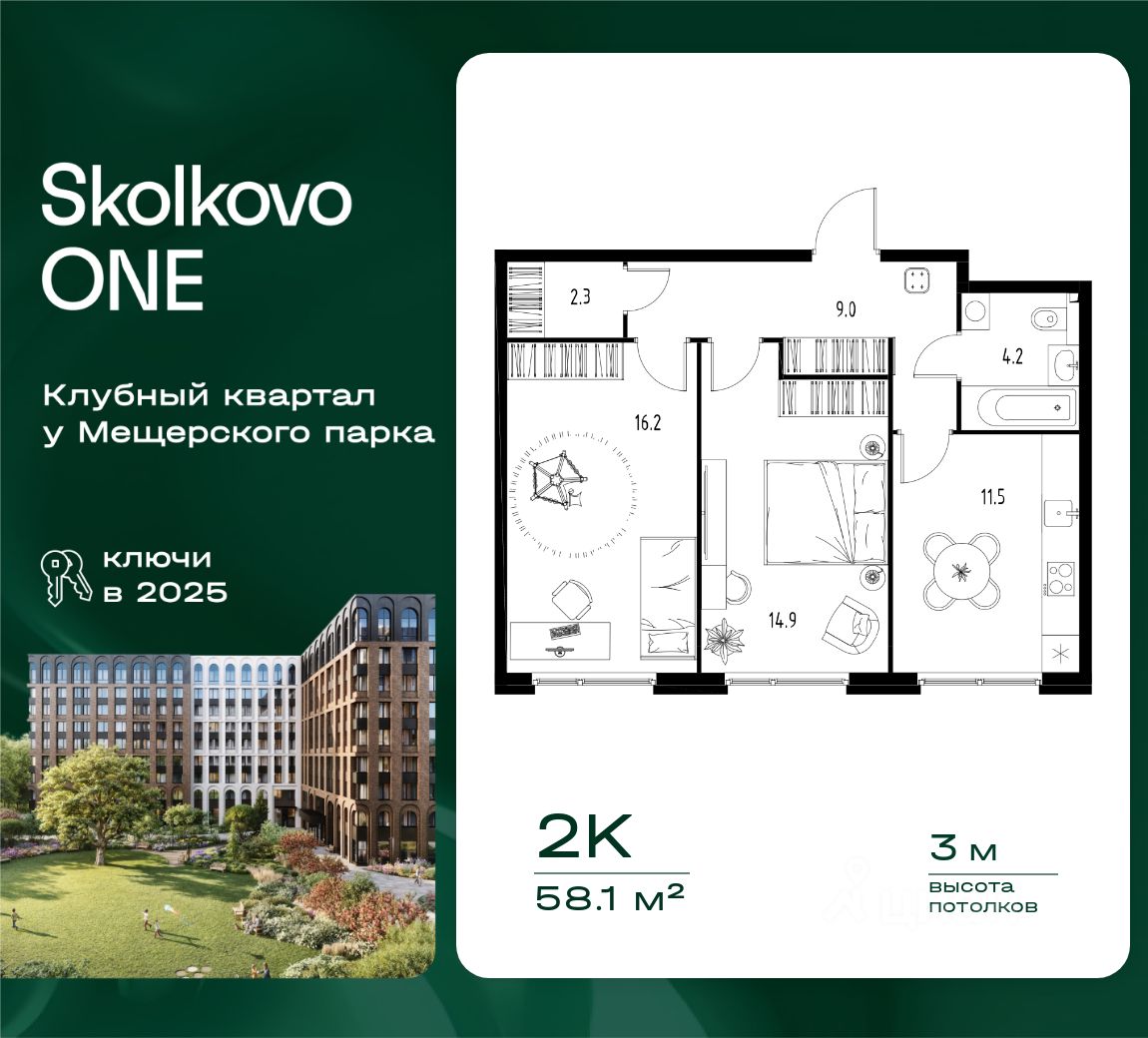 Квартира в корпусе 6 | 58,1 м² | 2 этаж из 9 | Дом сдан