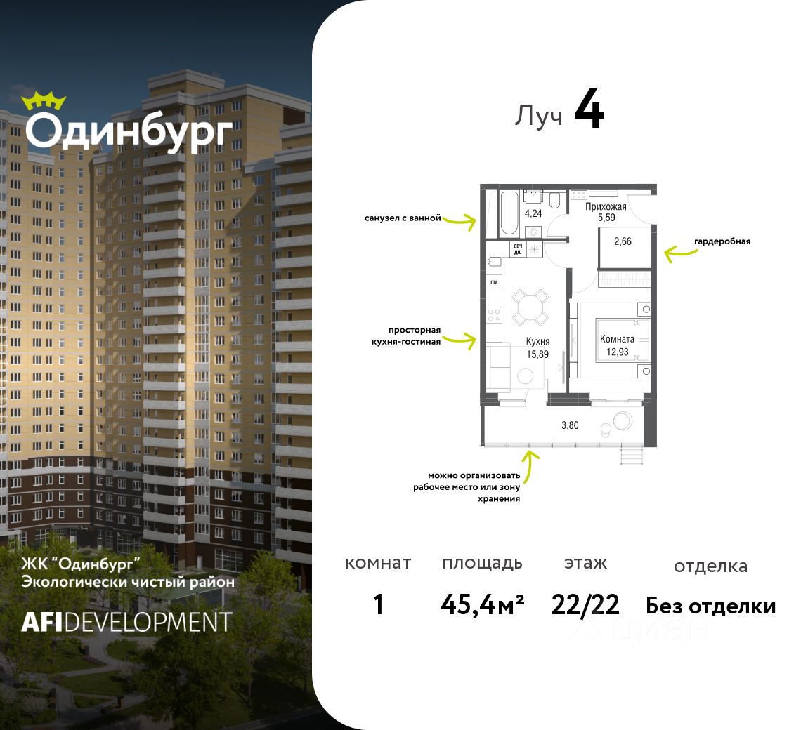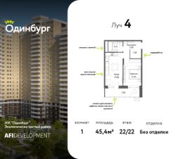 Предлагаем вашему вниманию уютную 1-комнатную квартиру общей площадью 45,4 кв.м на 22 этаже в новой очереди строительства ЖК "Одинбург". Этот обновленный проект от компании AFI Development включает в себя актуальные архитектурные решения и функциональные планировки. Для всех действует предложение от застройщика Назови свою скидку, подробности акции уточняйте у менеджеров отдела продаж.