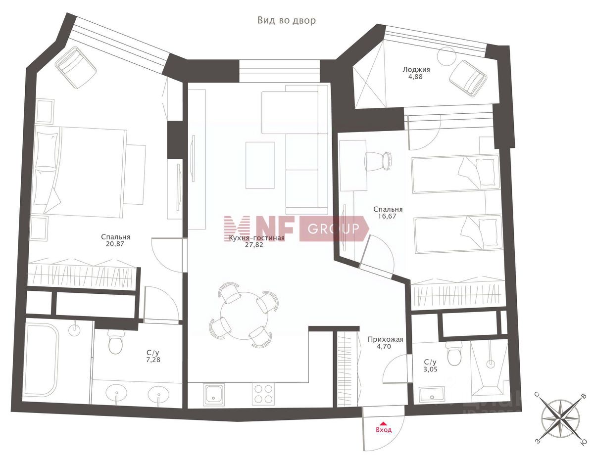 Планировка: гостиная-кухня, две спальни с собственными ванными комнатами. Есть просторная лоджия с хранением и теплым полом.
