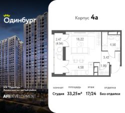 Предлагаем вашему вниманию уютную студию общей площадью 33,25 кв.м на 17 этаже в новой очереди строительства ЖК "Одинбург". Этот обновленный проект от компании AFI Development включает в себя актуальные архитектурные решения и функциональные планировки. Для всех действует предложение от застройщика Назови свою скидку, подробности акции уточняйте у менеджеров отдела продаж.