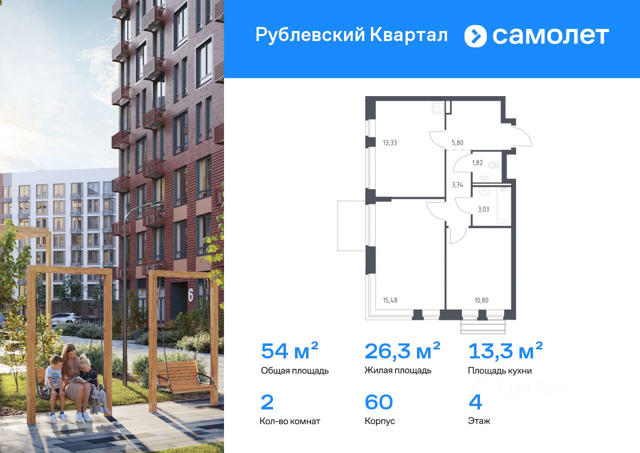 Предлагается 2-комнатная квартира комфорт-класса 54 кв.м в корпусе 60 на 4 этаже, в ЖК "Рублевский Квартал"