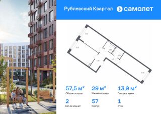 Предлагается 2-комнатная квартира комфорт-класса 57,5 кв.м в корпусе 57 на 1 этаже, в ЖК "Рублевский Квартал"