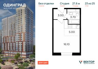 Прямая продажа от застройщика. Продается 1-комн. квартира площадью 27,6 кв.м на 23 этаже 25 этажного дома в ЖК "Одинград" от федерального девелопера ГК "Вектор".
