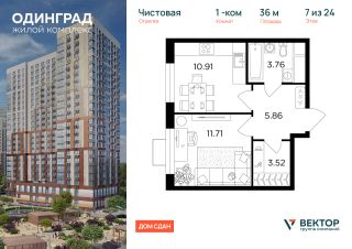 Прямая продажа от застройщика. Продается 1-комн. квартира площадью 36 кв.м на 7 этаже 24 этажного дома в ЖК "Одинград" от федерального девелопера ГК "Вектор".
