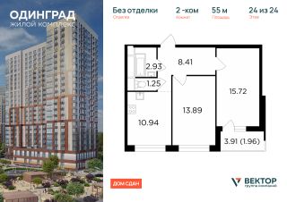 Прямая продажа от застройщика. Продается 2-комн. квартира площадью 55 кв.м на 24 этаже 24 этажного дома в ЖК "Одинград" от федерального девелопера ГК "Вектор".