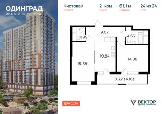 Прямая продажа от застройщика. Продается 2-комн. квартира площадью 61,1 кв.м на 24 этаже 24 этажного дома в ЖК "Одинград" от федерального девелопера ГК "Вектор".
