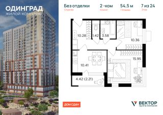 Прямая продажа от застройщика. Продается 2-комн. квартира площадью 54,5 кв.м на 7 этаже 24 этажного дома в ЖК "Одинград" от федерального девелопера ГК "Вектор".