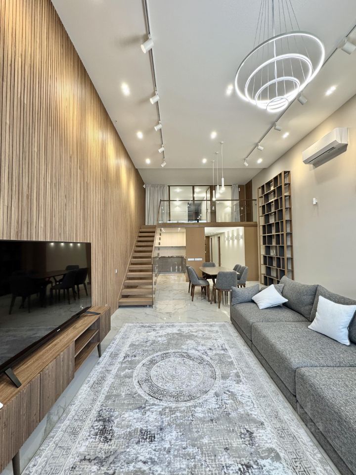 По планировке: просторная гостиная, столовая с потолком более 4,6 метров и выходом на лоджию 15 метров откуда открывается прекрасный вид на парковую зону поселка, кухня, при входе просторная полностью оборудованная гардеробная комната и полноценный санузел, постирочная комната.