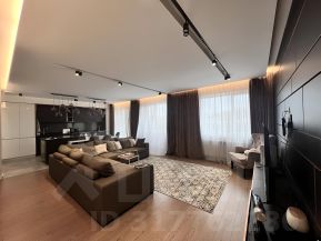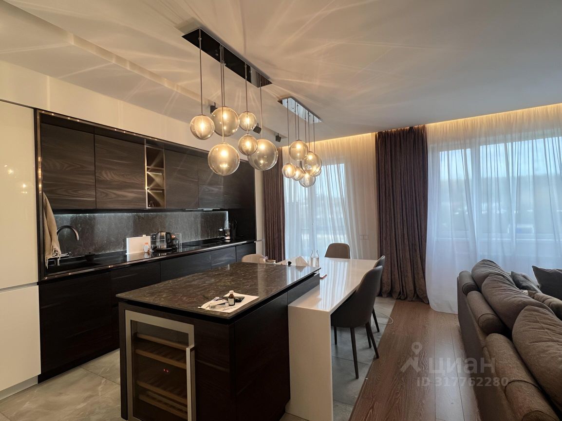 Современная кухня совмещена с просторной гостиной. В кухне вечерняя подсветка, много шкафов для хранения, встроенная техника (холодильник, микроволновка, духовка, стеклопанель плита, вытяжка, винный холодильник). Остров со встроенным большим столом, шкафами для хранения и дизайнерским освещением. Приточная общая вентиляция и вытяжка над варочной панелью.
