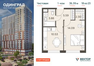 Прямая продажа от застройщика. Продается 1-комн. квартира площадью 36,39 кв.м на 18 этаже 23 этажного дома в ЖК "Одинград" от федерального девелопера ГК "Вектор".