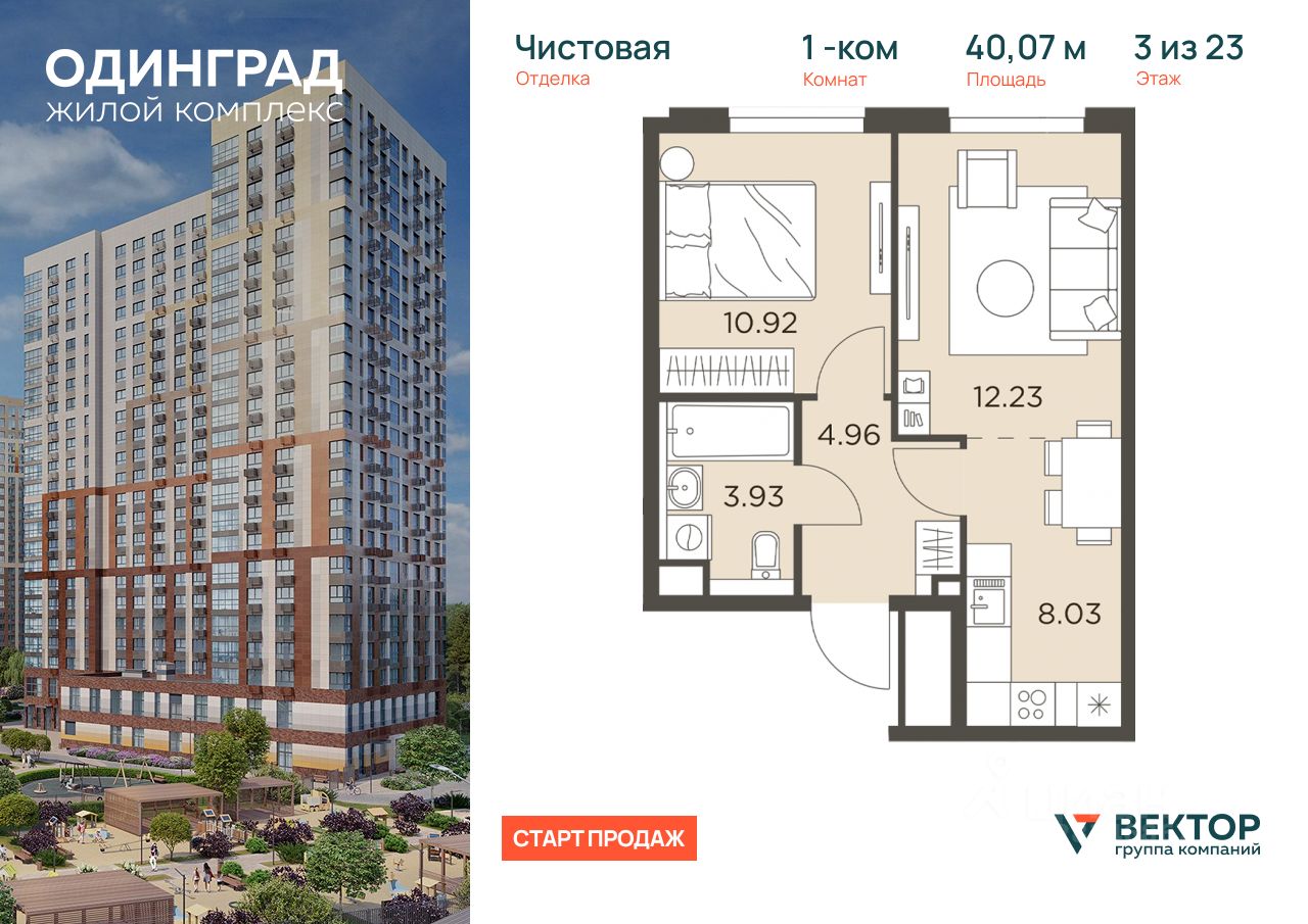 Прямая продажа от застройщика. Продается 1-комн. квартира площадью 40,07 кв.м на 3 этаже 23 этажного дома в ЖК "Одинград" от федерального девелопера ГК "Вектор".