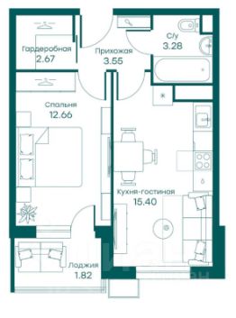 Кухня-гостиная 15,4 кв.м., жилая комната 13