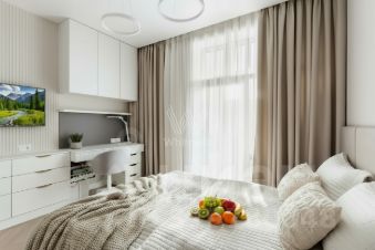 Дизайнерская квартира с двумя спальнями в комплексе премиум-класса "Сколково Парк". Квартира площадью 80 м² расположена на шестом этаже в корпусе 6. Выполнена дизайнерская отделка в неоклассическом стиле с использованием высококачественных материалов: премиальная английская краска Little Green, паркетный пол гармонирует с дубовыми дверьми Union. Электроприводы позволяют регулировать шторы бесшумно — со смартфона или через "Алису". Панорамные окна Schuco открывают вид в уютный двор.