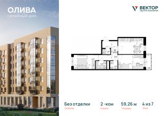 Продается 2-комн. квартира площадью 59,26 кв.м на 4 этаже 7 этажного дома в ЖК "Семейный дом Олива" от федерального девелопера ГК "Вектор".