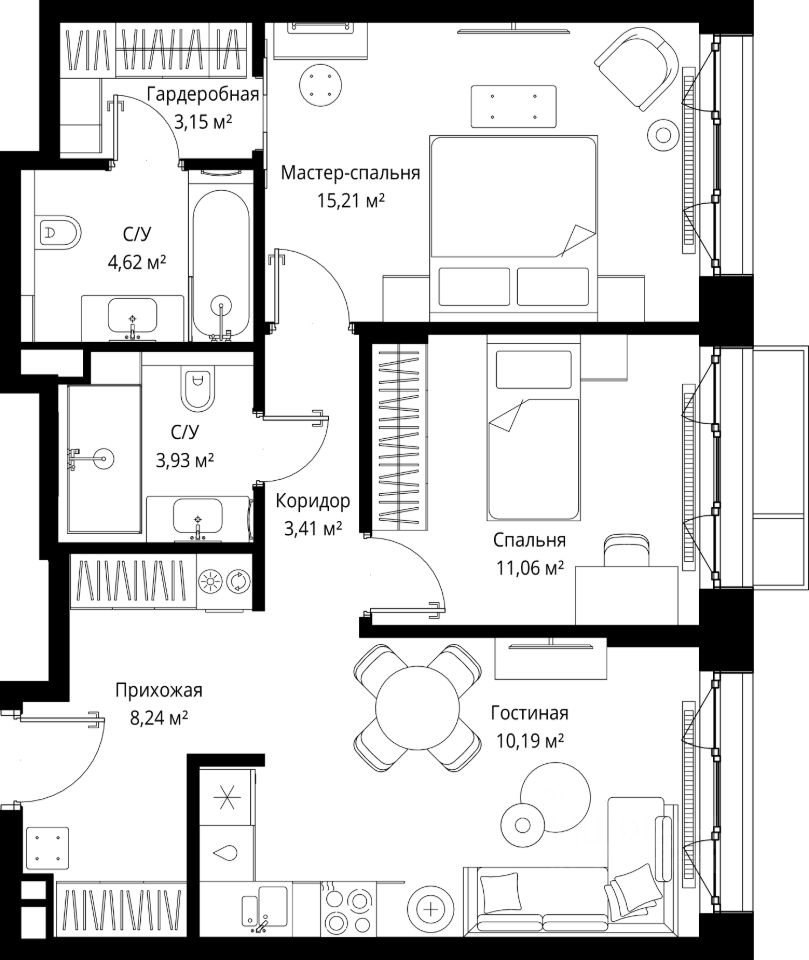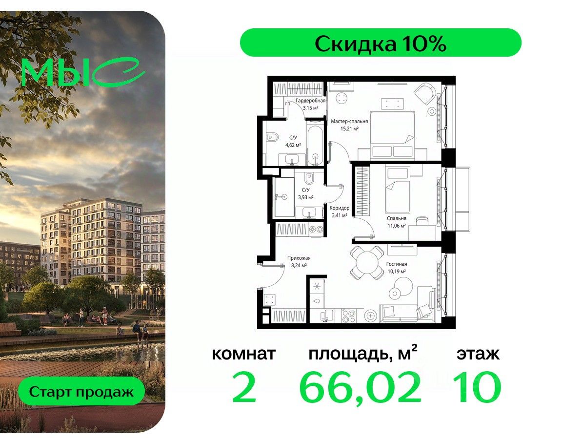 Продаётся 2-комнатная квартира общей площадью 66.02 м² без отделки в премиальном жилом комплексе "МЫС" на 10-м этаже 12 этажного дома. Квартира расположена в корпусе "Волга".